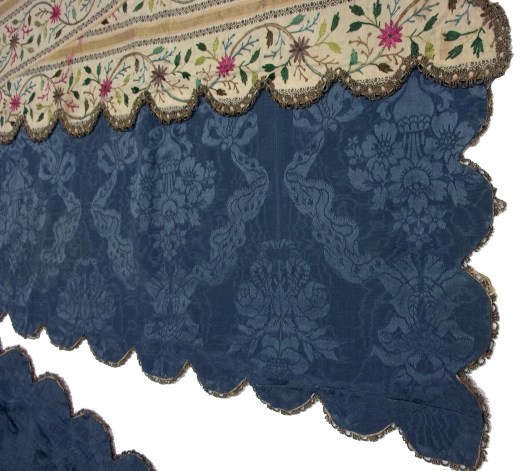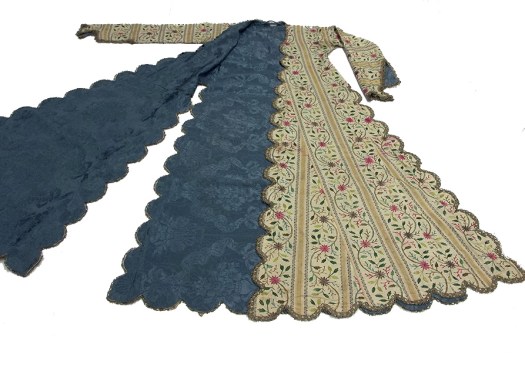 Finishing – to finish the edges of the entari I could see that the top striped fabric was hemmed at the edges – turned in together with the blue lining and hand stitched with whip stitch. The braiding was then stitched along the edges of the top fabric. I could not see any facings or interlinings.