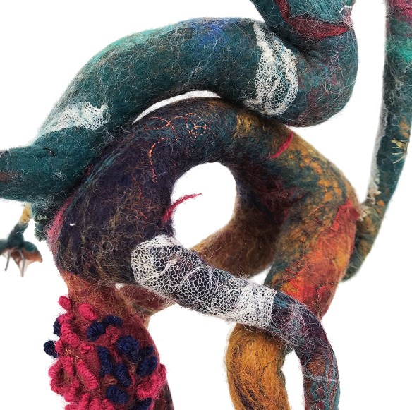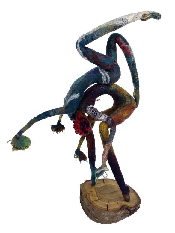 Dance a Deux is a wet felted sculpture of two dancers, one balanced on the other. The pose is inspired by a Modern Dance sequence.
