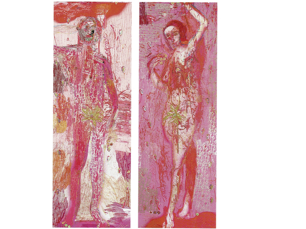 Thread and beads on printed canvas. Each panel 260cm x 90cm. 2020