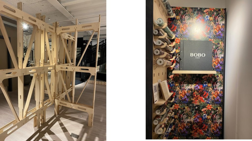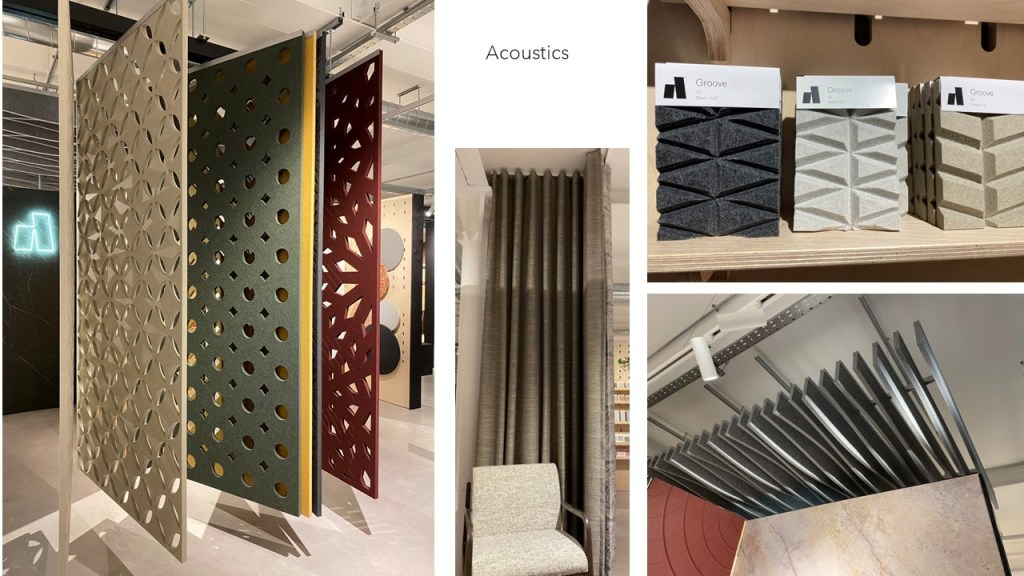 Acoustic wall panels, tiles and ceiling ‘clouds’ – synthetic manufactured.