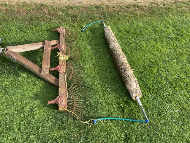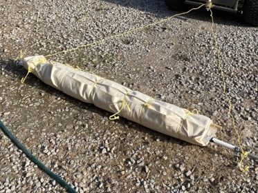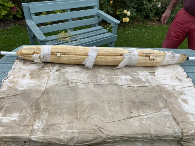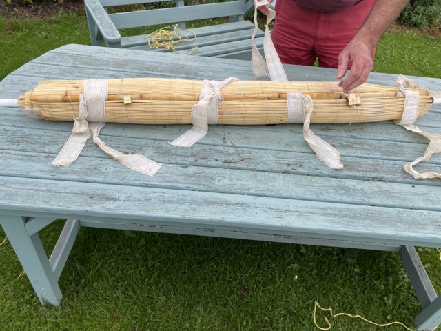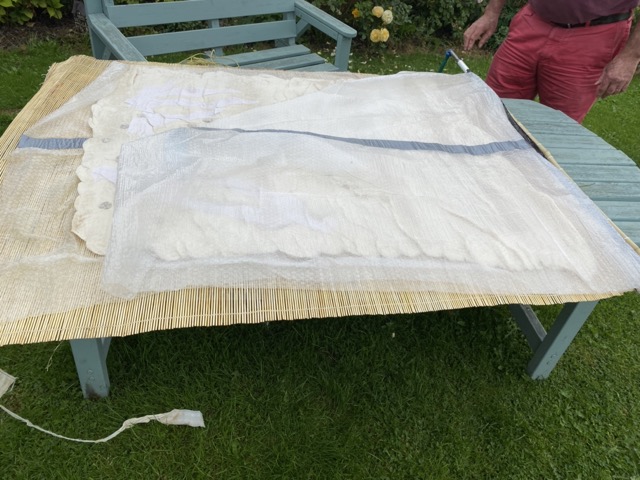 – well wetted with soapy water and rolled up between bubble wrap and bamboo blind. The roll was then wrapped in a length of heavy canvas and tied with baling twine.