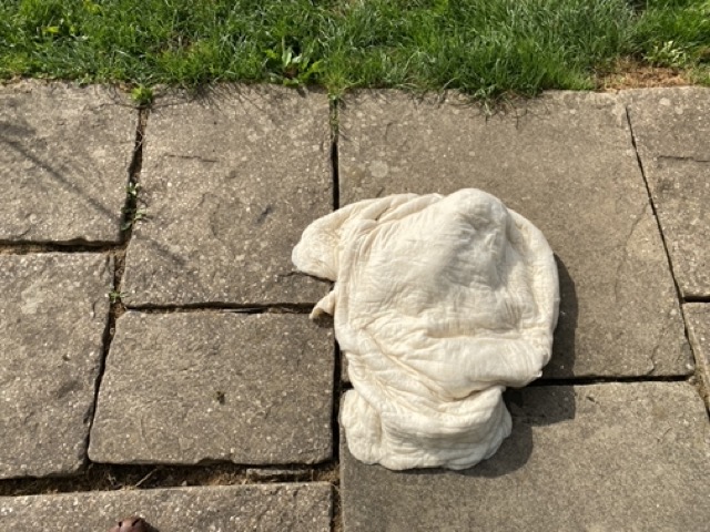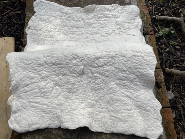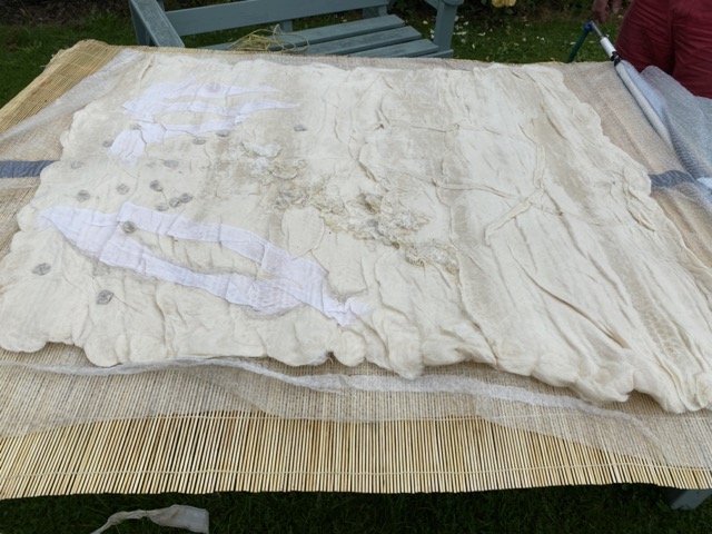 I fulled the felt by throwing it down on the stone path x 20 times (good exercise, bending at the knees!), followed by more fulling in a sink of hot water, moving the fabric for about 5 minutes – it did not take long.