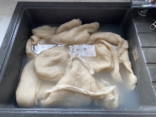Next, to create a very well fulled, stiff fabric I put the felt into the washing machine on a 30 degree C / 20 minute wash. The resulting fabric is just what I need and I have not had to used much physical energy to make it.