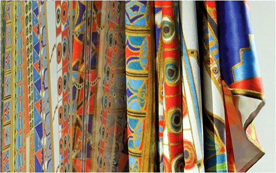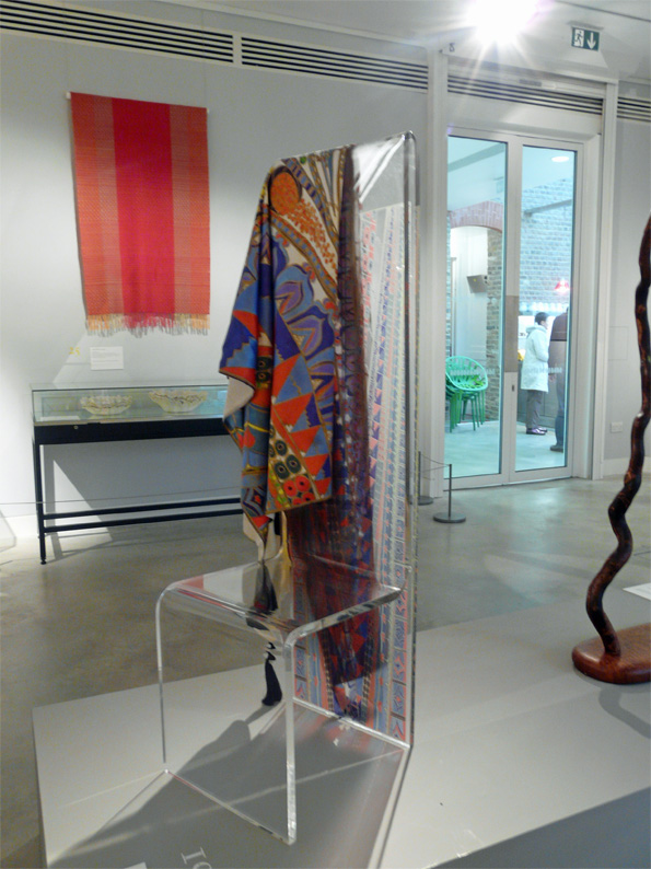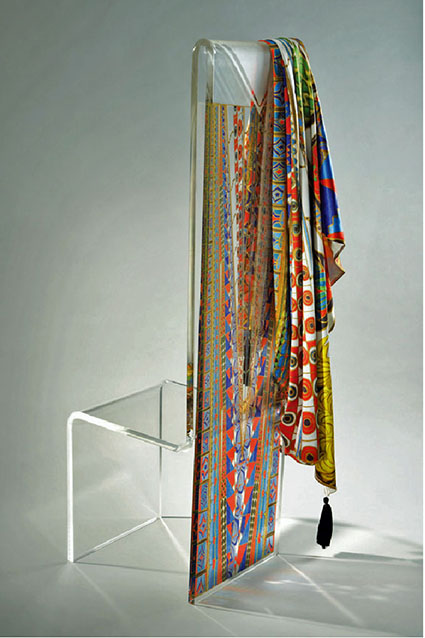 Digitally printed acrylic chair and silk throw: Molly chose the theme of supermarkets and shopping malls, a feature of 21st century consumer society, to develop a decorative design. She has used modern digital technology to print the design onto two contrasting materials – a traditional woven silk throw and a contemporary clear acrylic chair. She collaborated with Paul Turner at Clearly Modern to make the chair.