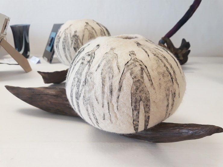 White, natural Blue Faced Leicester wool bowl, Lino printed with a figurative motif. This small bowl looks wonderful against the contrasting, polished dark wood.