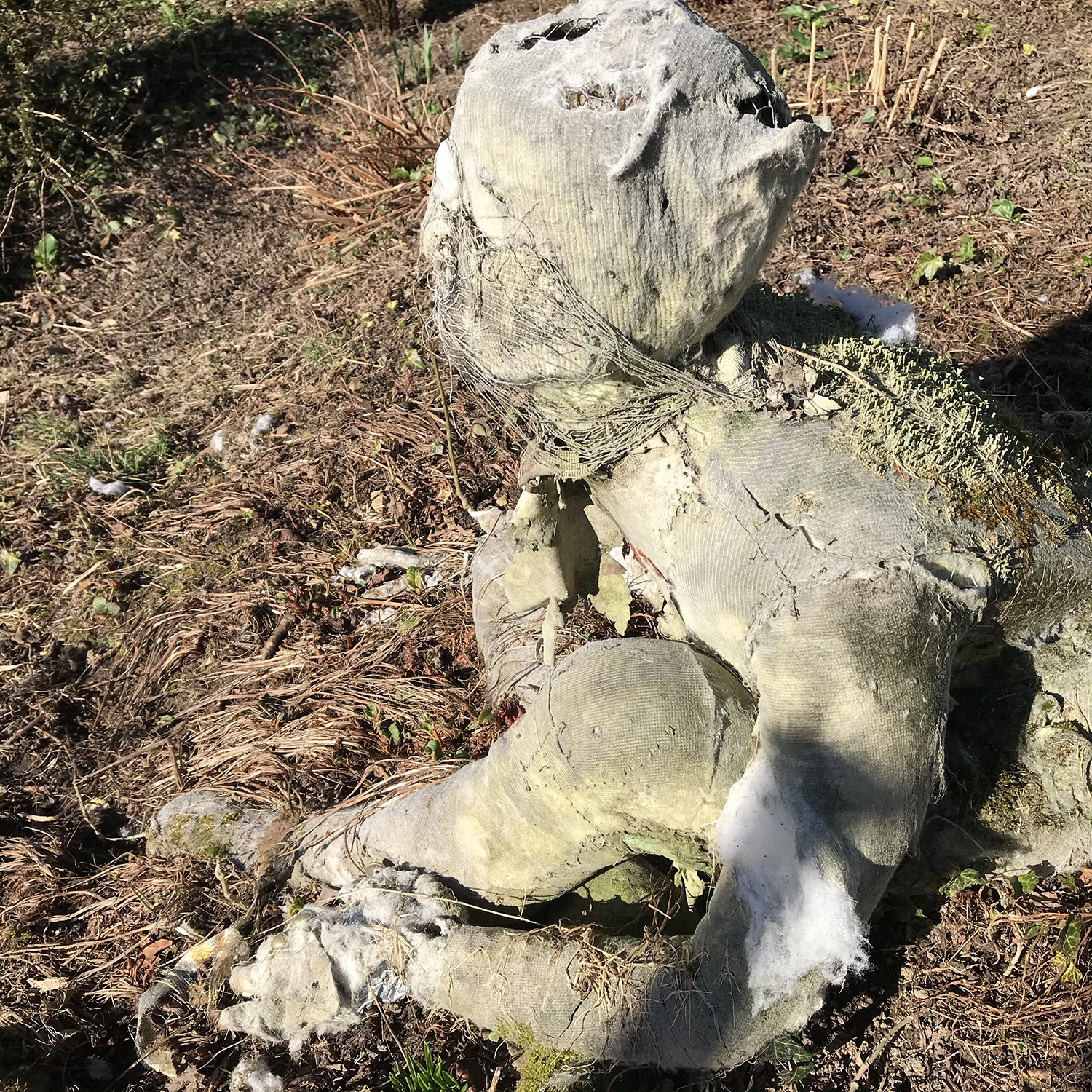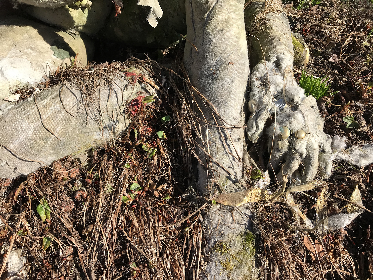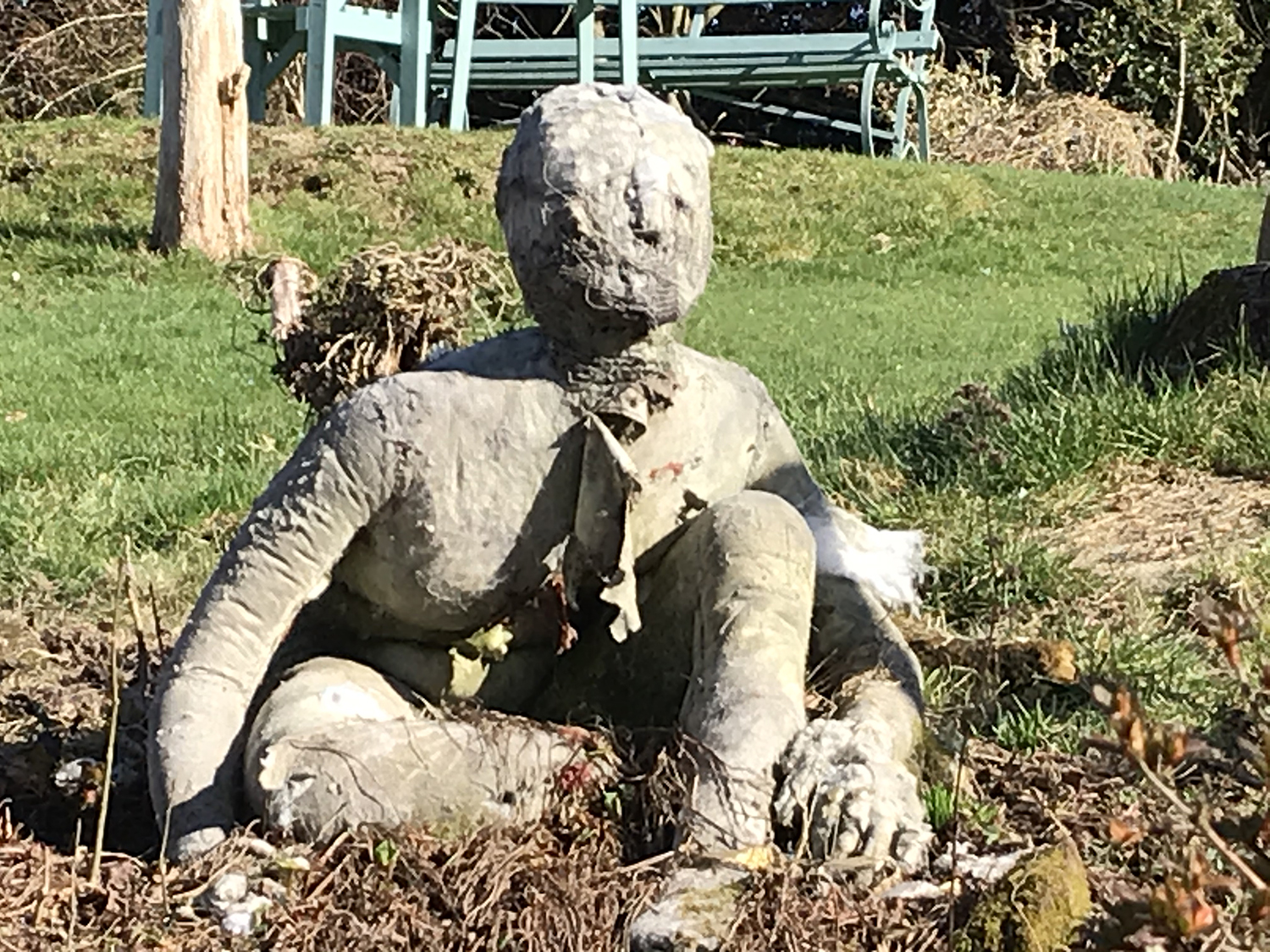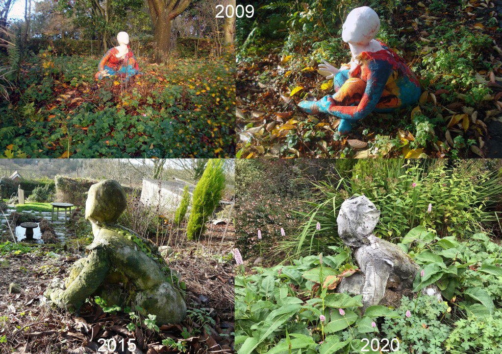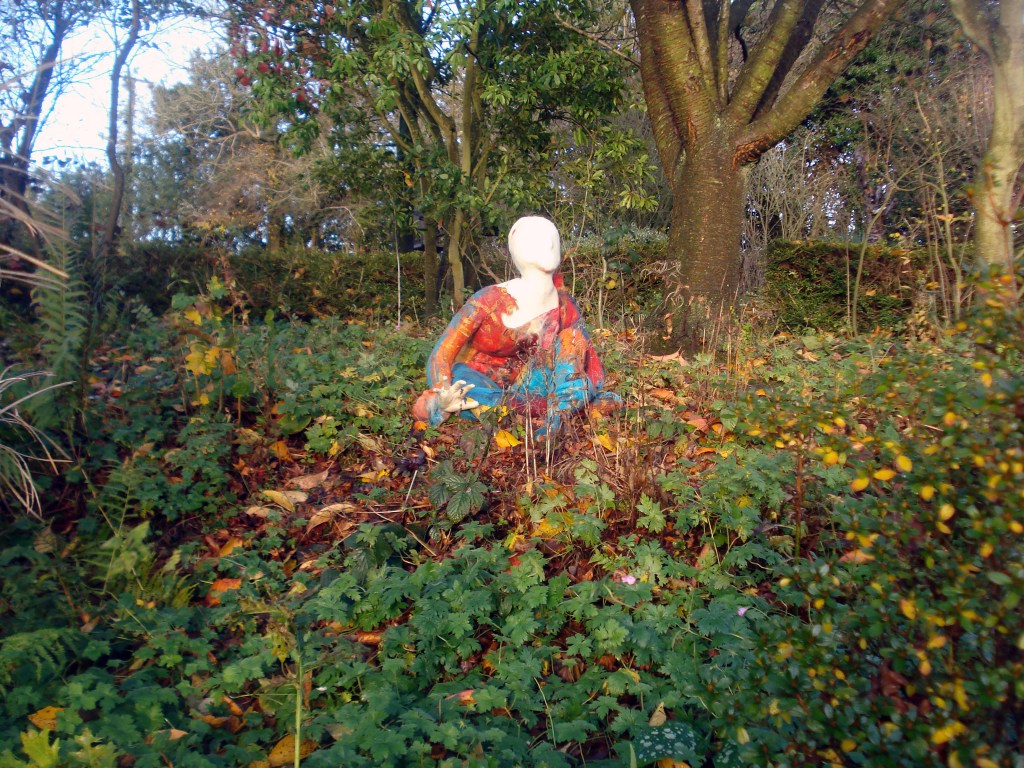 My family moved house in 2009 and arrived at the new property very late on a cold, wet winter’s evening. Needless to say we were all very keen to get the van unloaded as quickly as possible! As my son brought the Felted Lady out of the van I told him to put her in the wooded part of the garden.This was intended to be a temporary home however she has stayed there ever since- to be known as The Garden Lady
