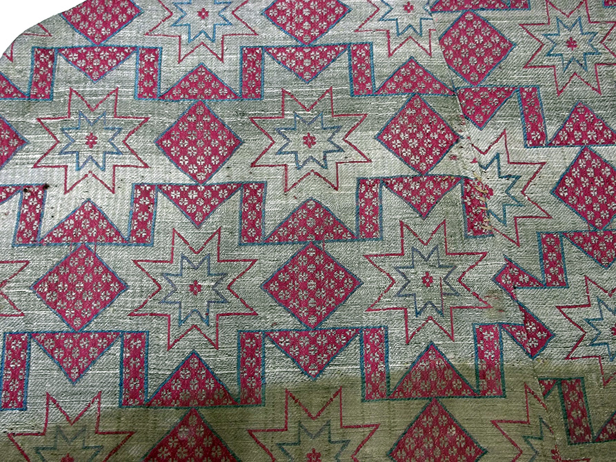 The main colours were white/cream and red with some blues and yellow. Green was seldom used as there were no natural green dyes and the colour had to be made by over dying yellow with blue. The metallic yarns were made by loosely wrapping yellow and white yarns with silver strips – the white yarn enhancing the silver and the yellow coming through the silver creating a gold colour.