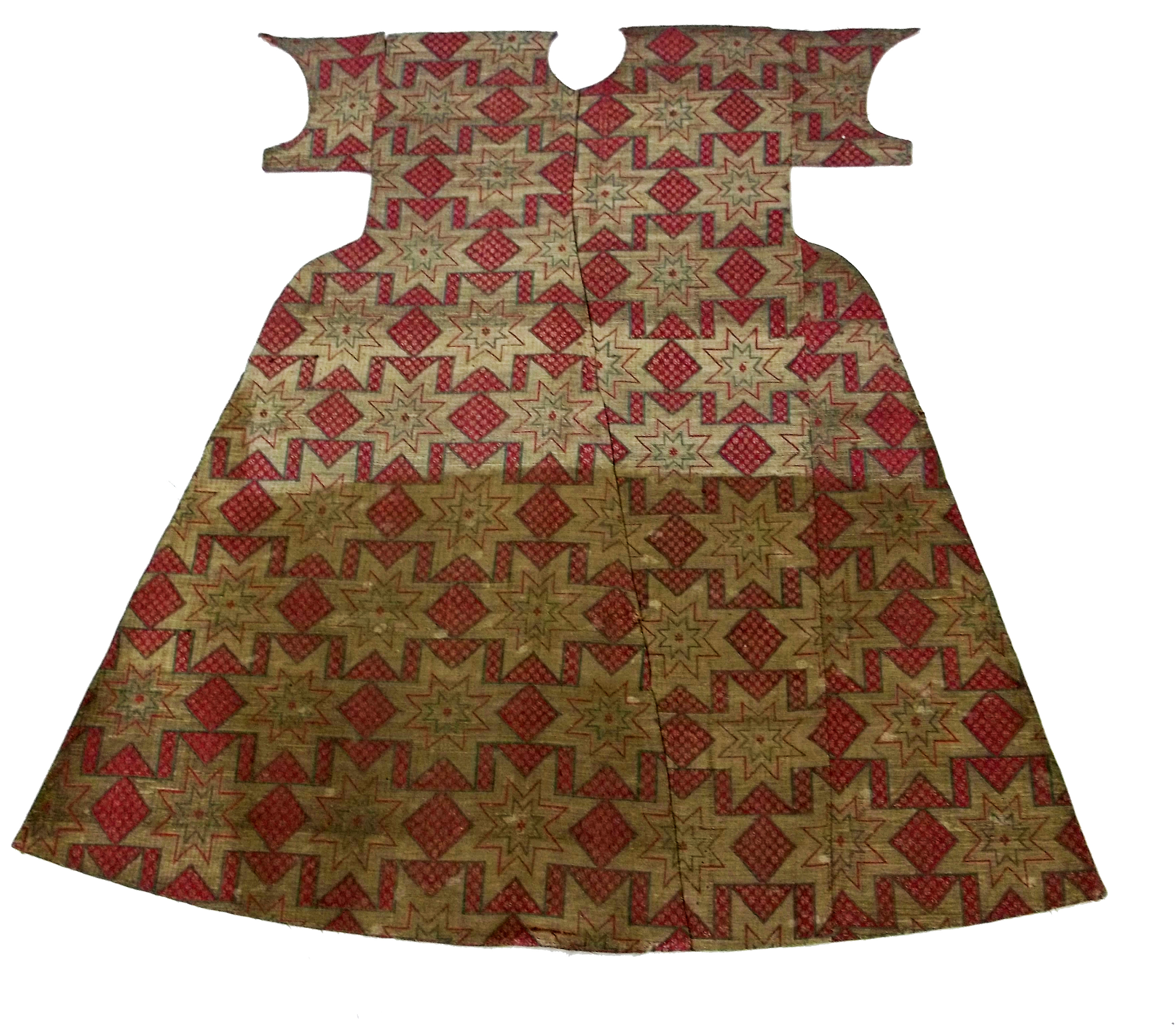 This “star” design kaftan illustrates how a small kaftan could be cut from one width of fabric with a separate gore added on the right side to complete the shape. Pattern pieces were cut to fit the fabric with as little wastage as possible.