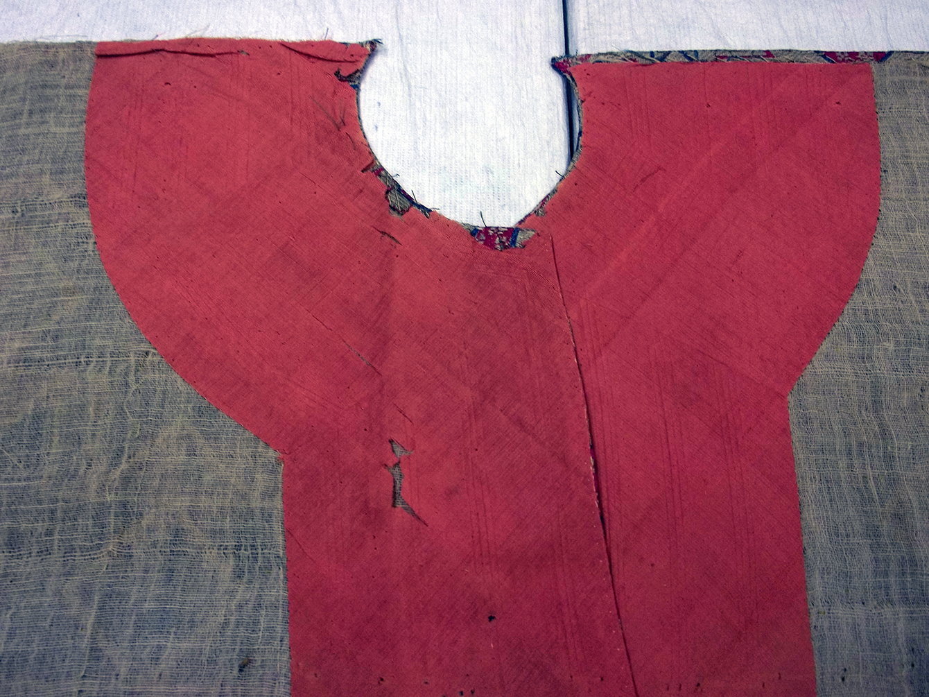 This image shows the back/lining details of the Star kaftan. Bias cut facings (12cm wide) of red/orange silk are stitched around the openings – sleeves, neck, front, and hems. Facings are found in blue, red, orange and rose colours and sometimes match the main colour of the kaftan. The facings are attached to the kaftan by single seam.